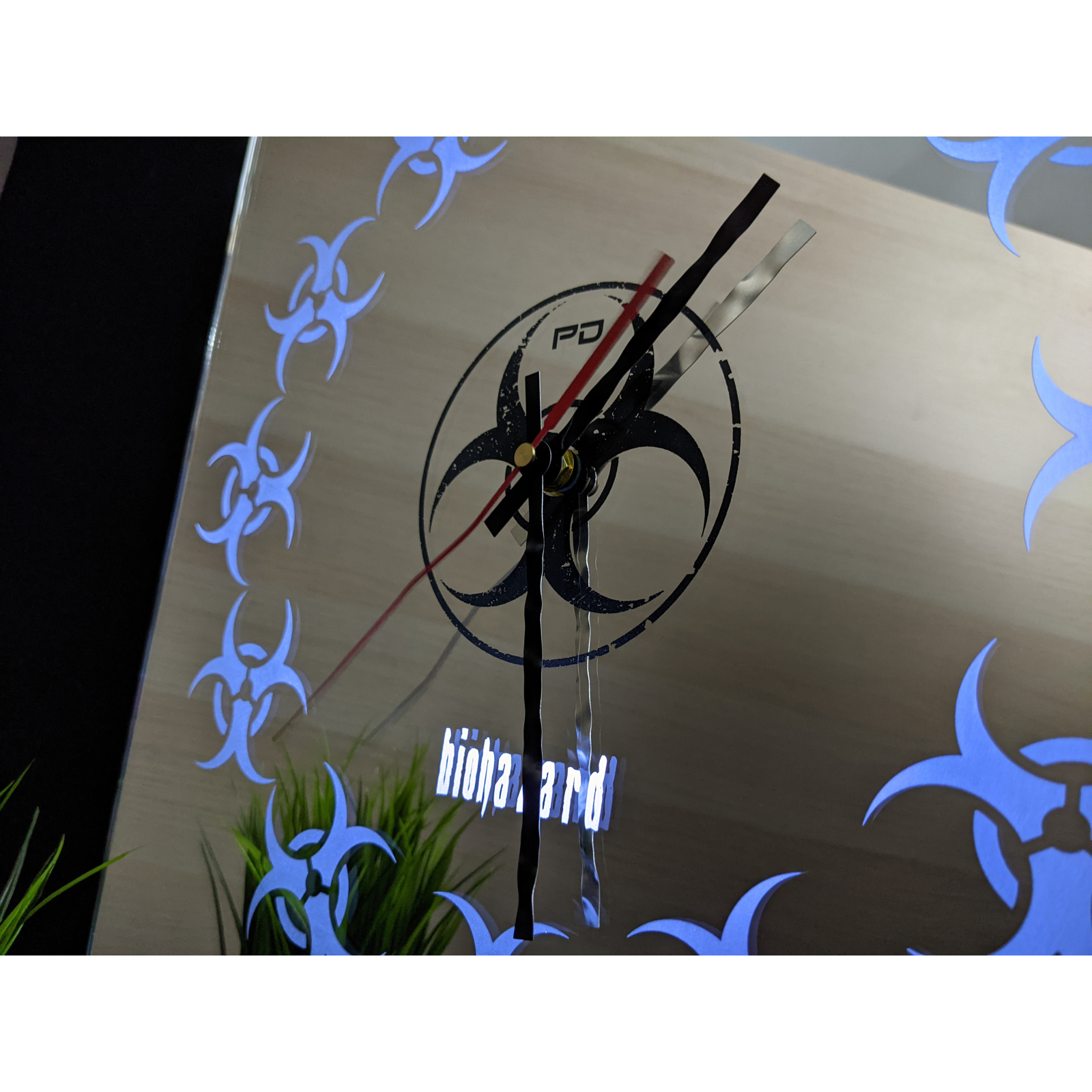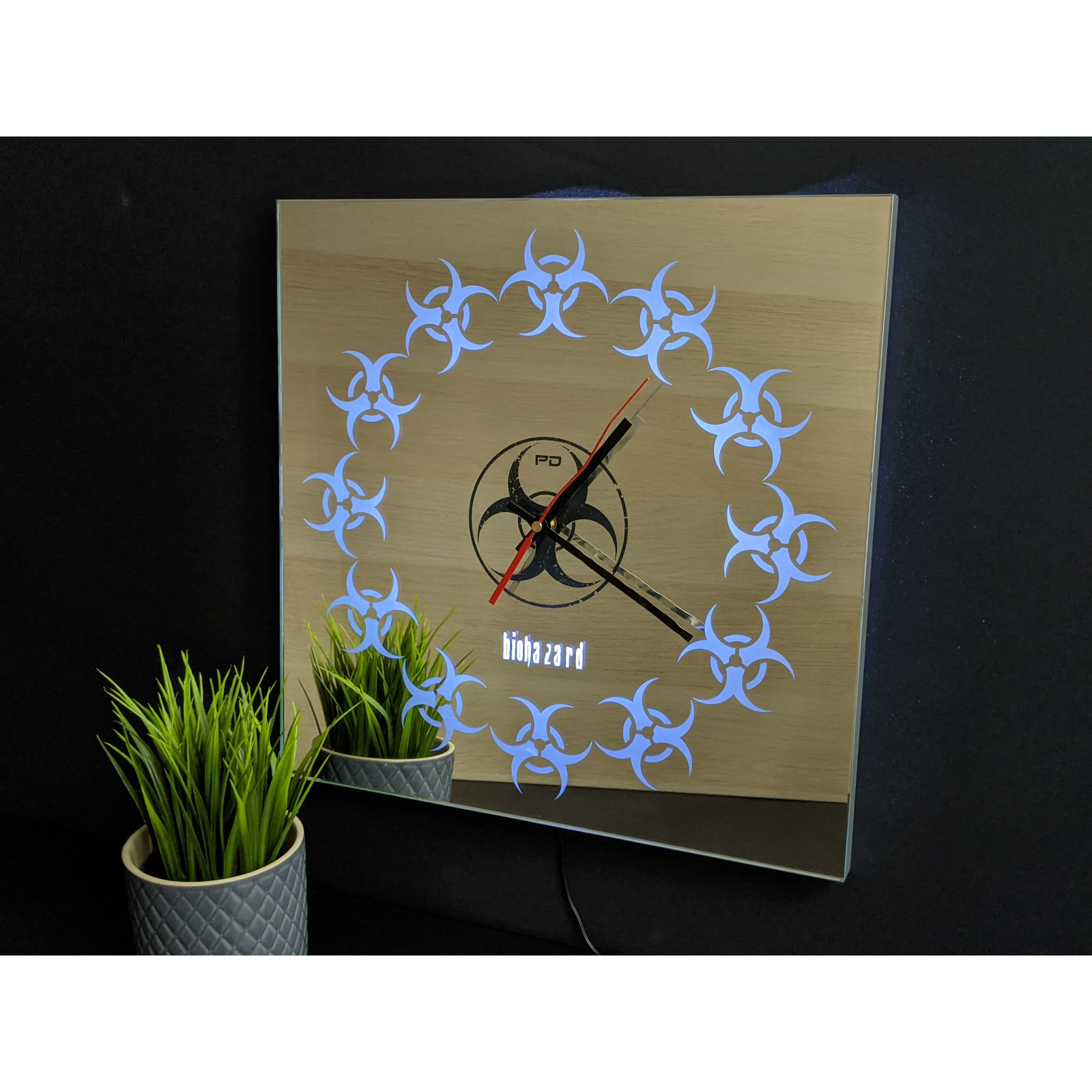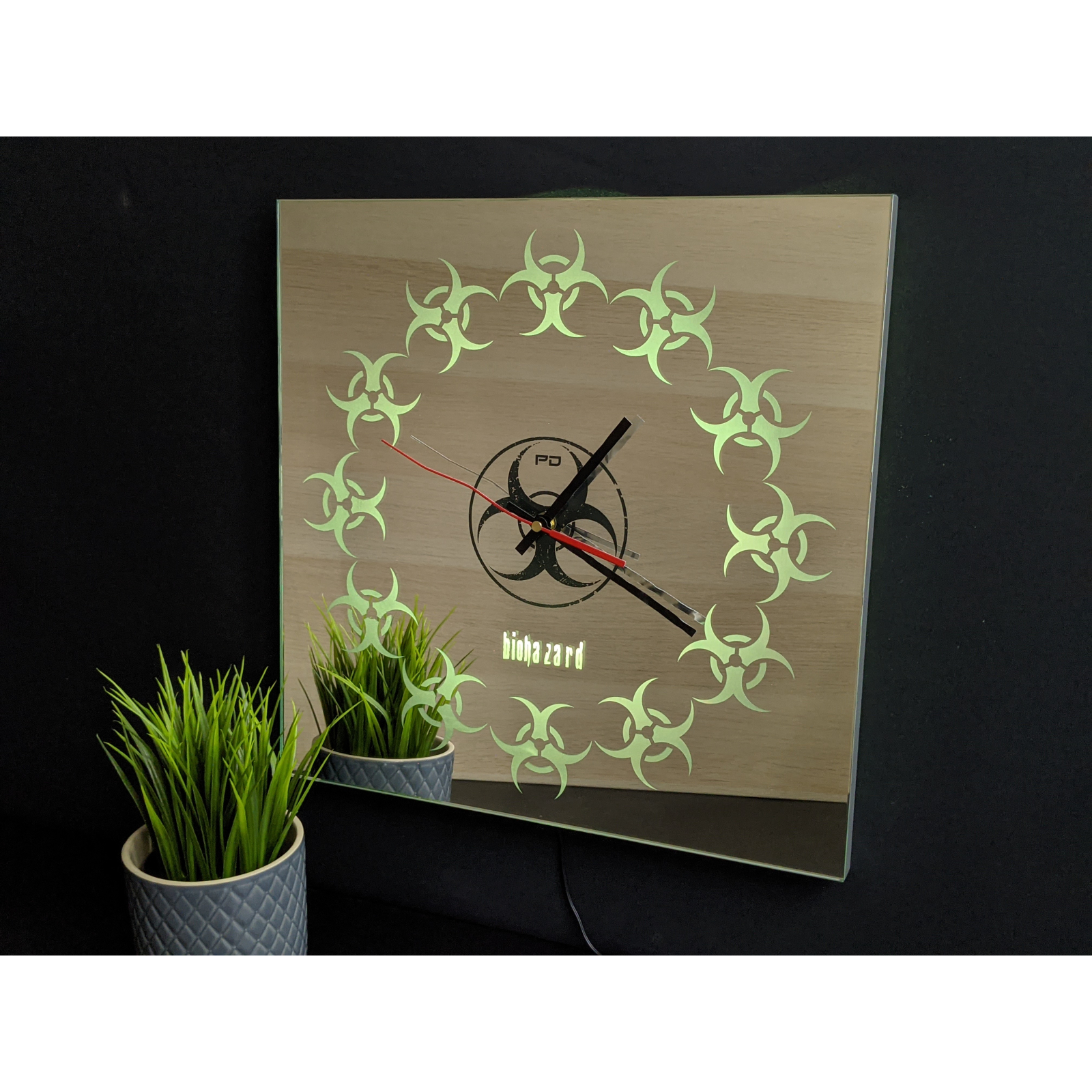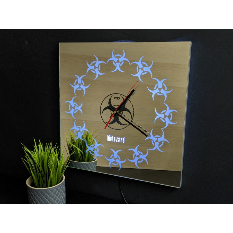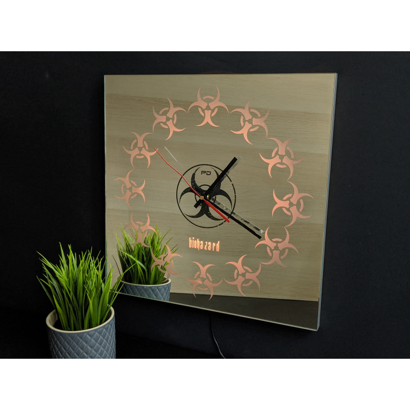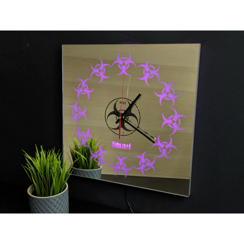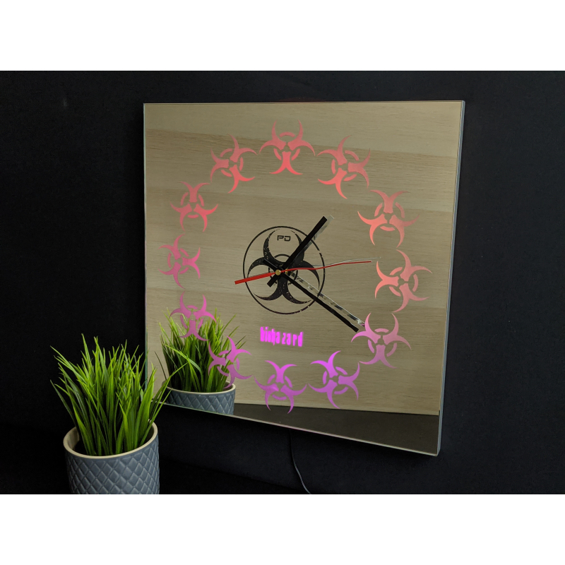 De Neon Mirror Clock is een klok dat is opgebouwd uit een geslepen spiegel waarvan het zilver aan de achterkant op de plek van de wijzerplaat is weg gegraveerd met een co2 laser, een aluminium lijst en RGB led verlichting met talloze functies en kleurencombinaties.