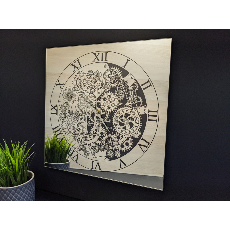 De Mirror Clock is een klok dat is opgebouwd uit een geslepen spiegel waarvan het zilver aan de achterkant op de plek van de wijzerplaat is weg gegraveerd met een co2 laser, een aluminium lijst en een uniek grafisch ontwerp in een vaste kleur.