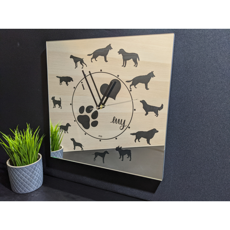 De Mirror Clock is een klok dat is opgebouwd uit een geslepen spiegel waarvan het zilver aan de achterkant op de plek van de wijzerplaat is weg gegraveerd met een co2 laser, een aluminium lijst en een uniek grafisch ontwerp in een vaste kleur.