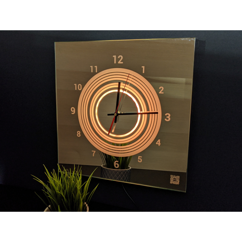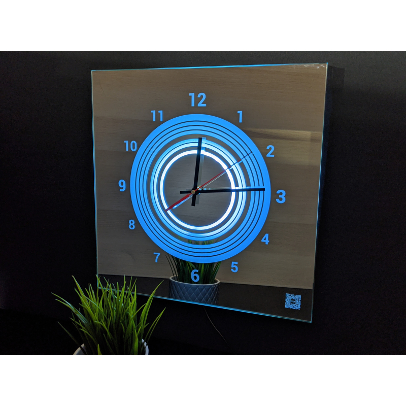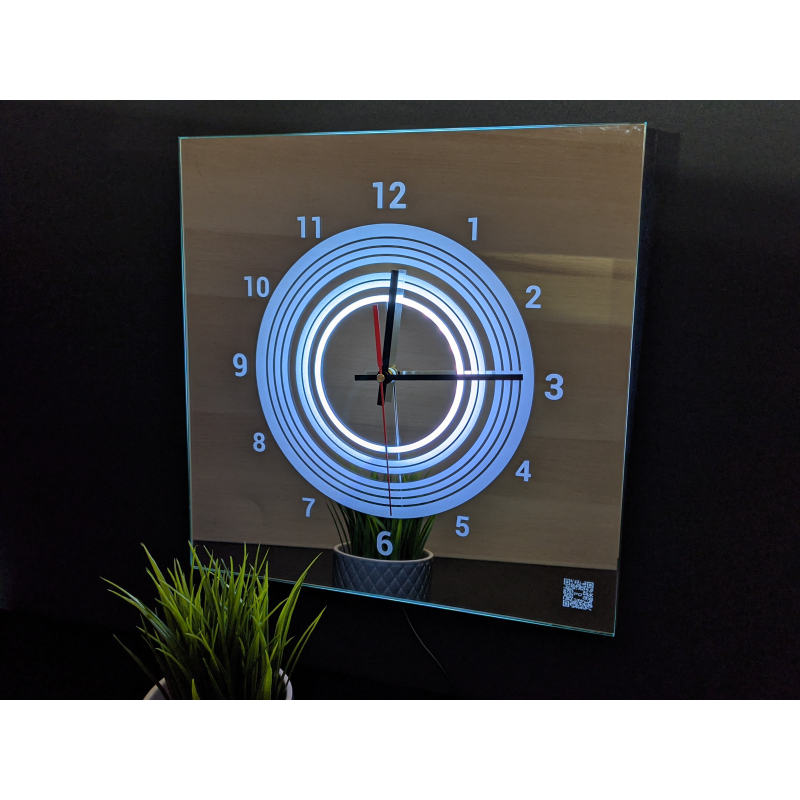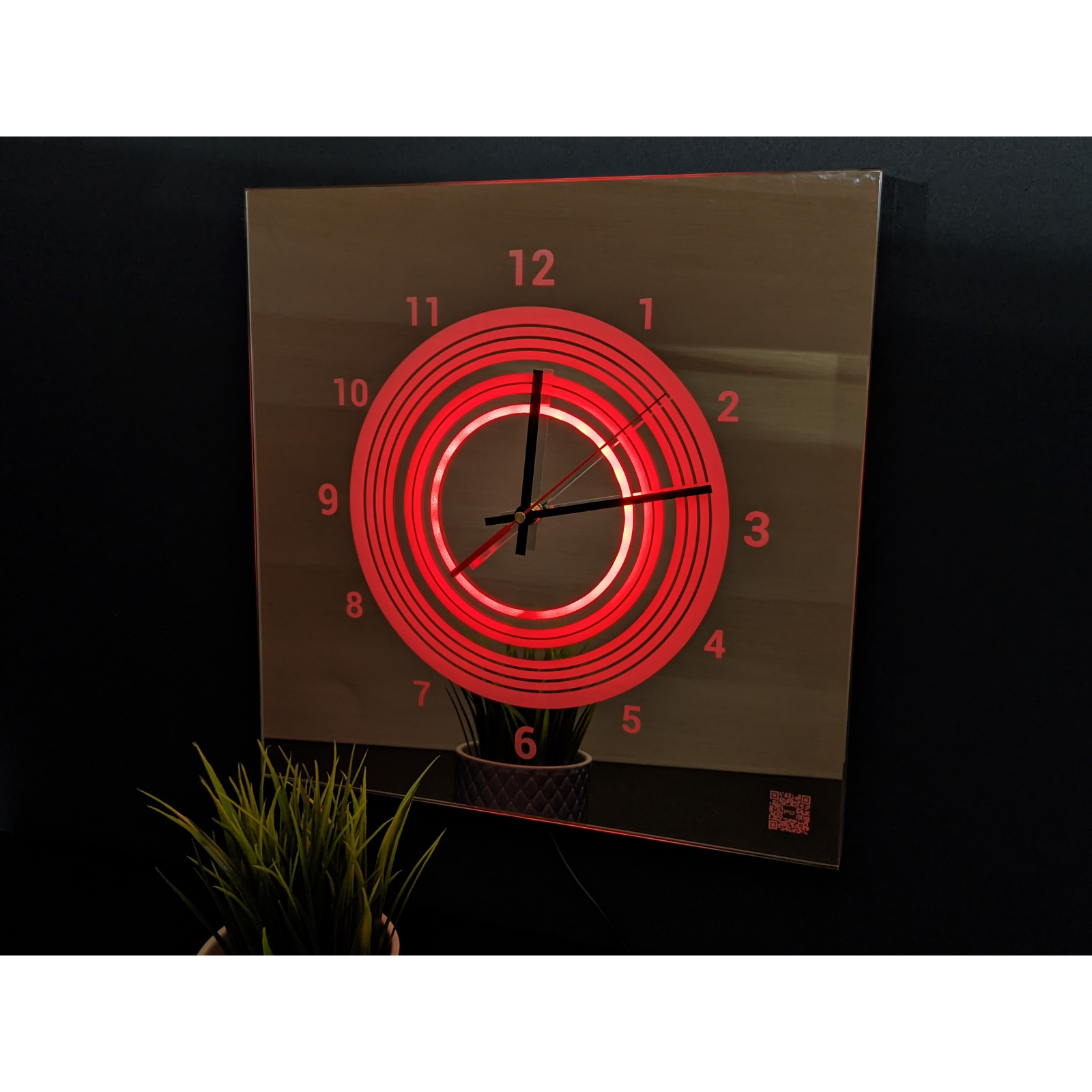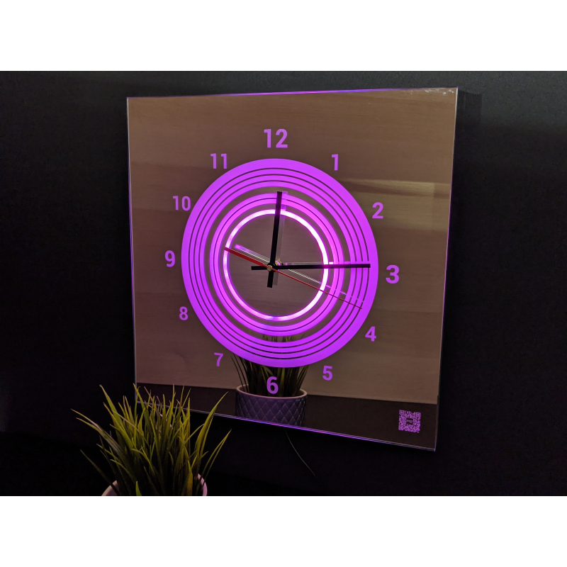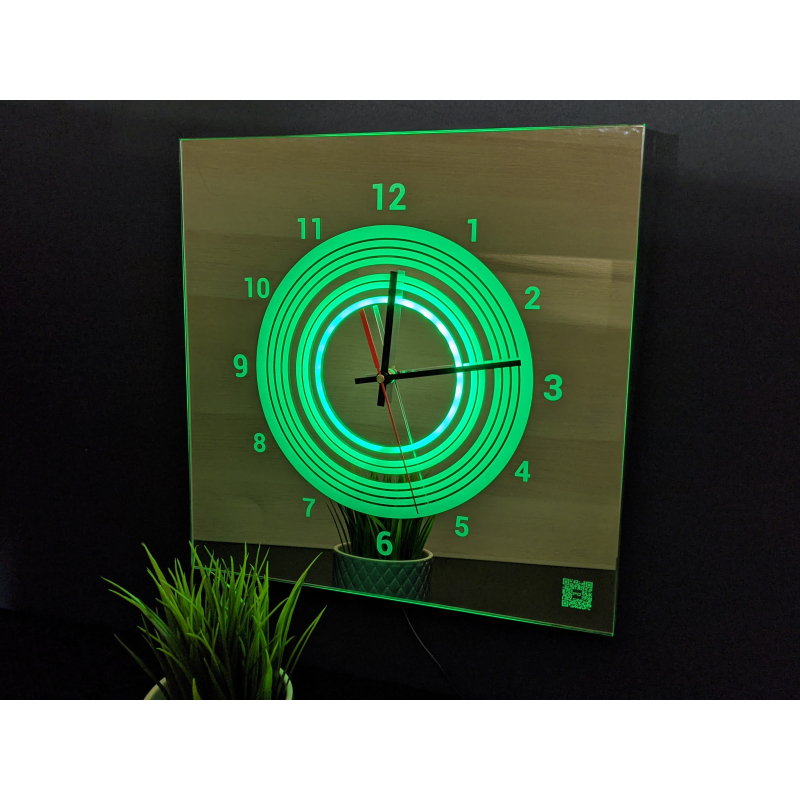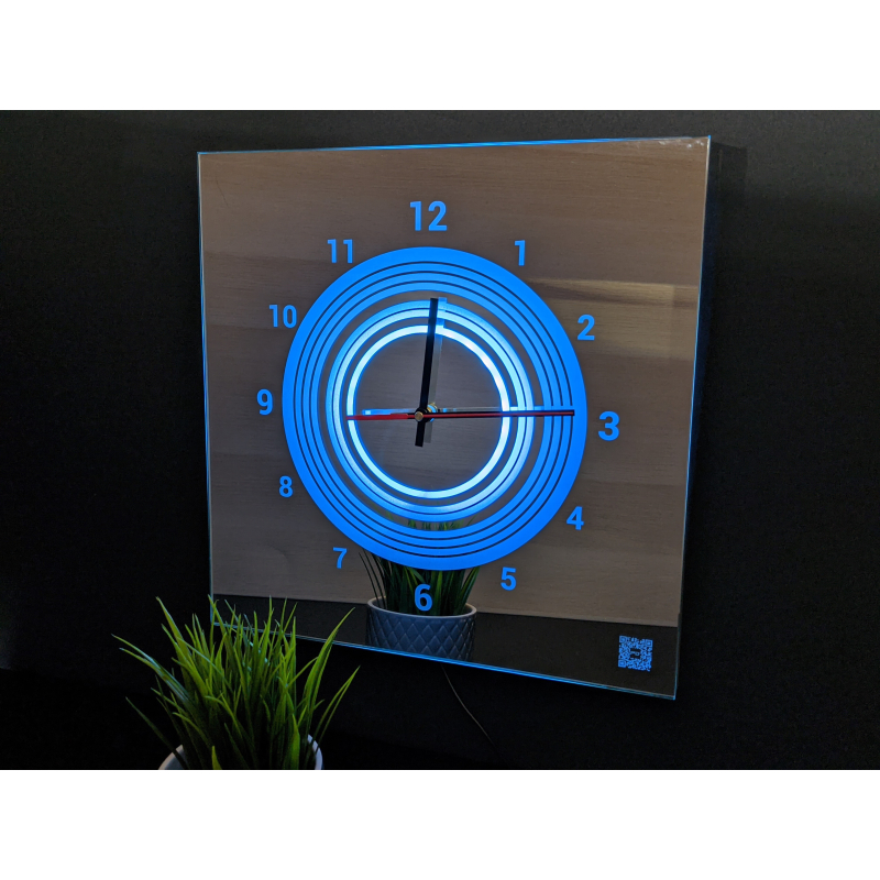 De Neon Mirror Clock is een klok dat is opgebouwd uit een geslepen spiegel waarvan het zilver aan de achterkant op de plek van de wijzerplaat is weg gegraveerd met een co2 laser, een aluminium lijst en RGB led verlichting met talloze functies en kleurencombinaties.