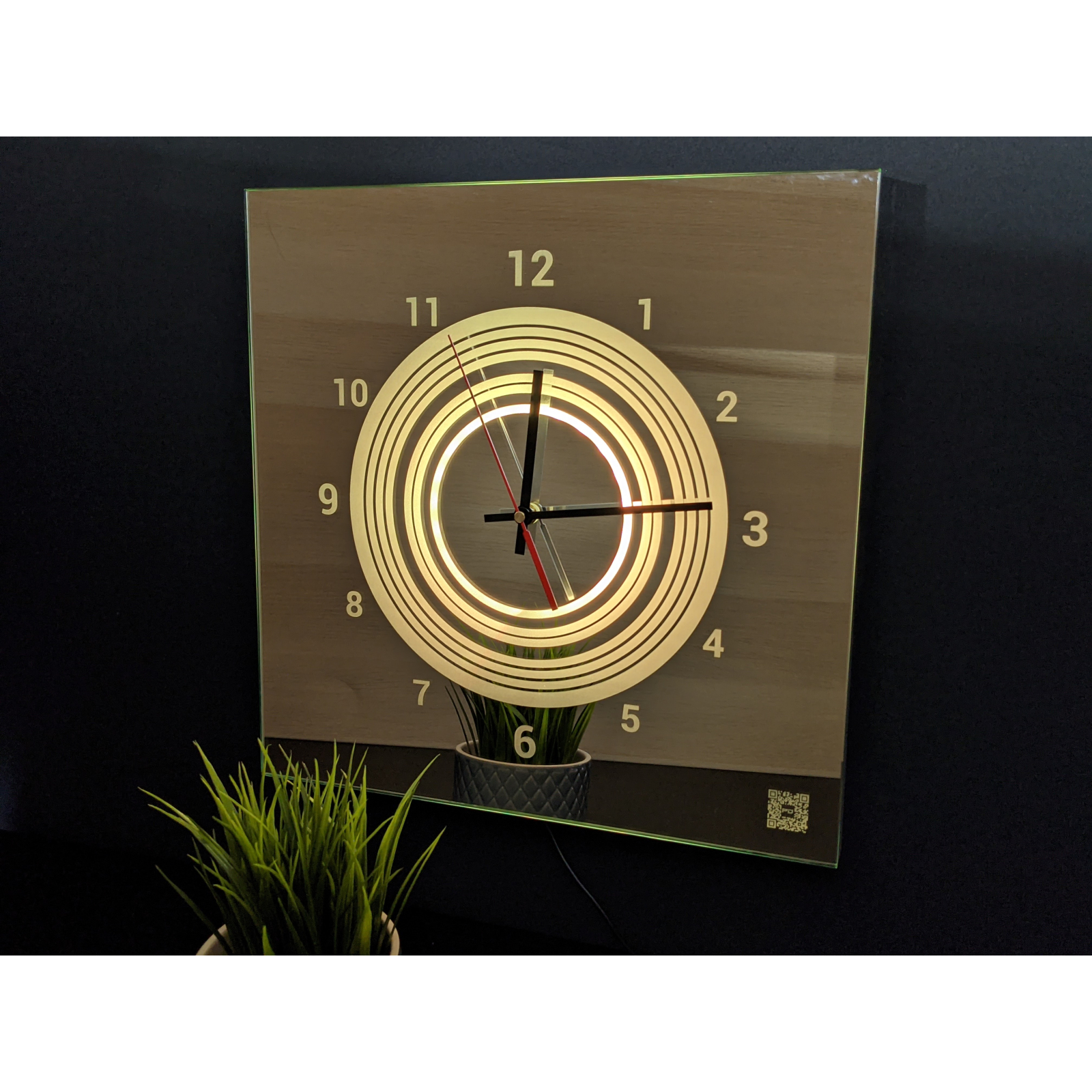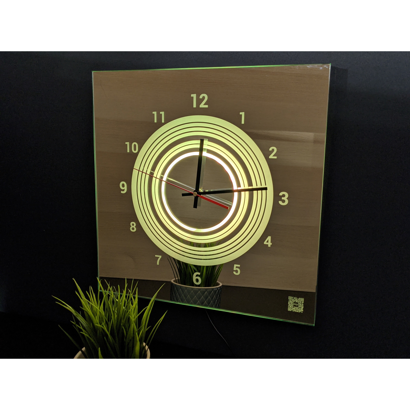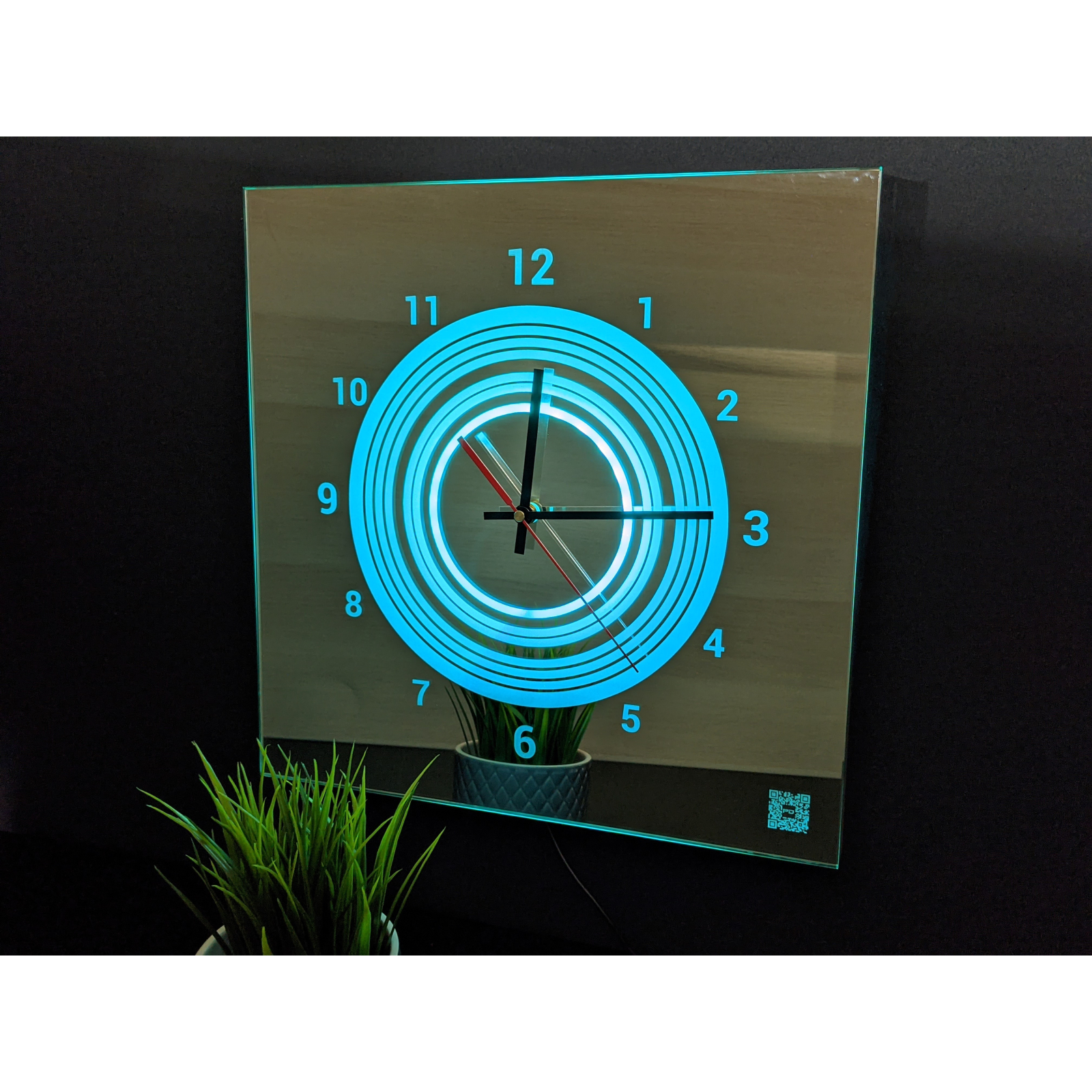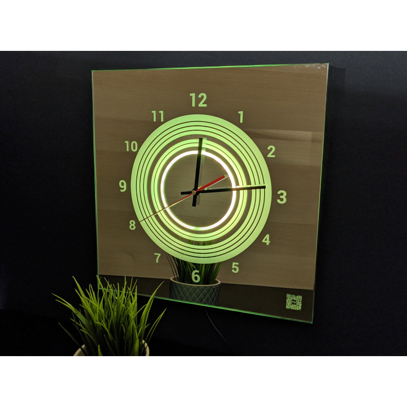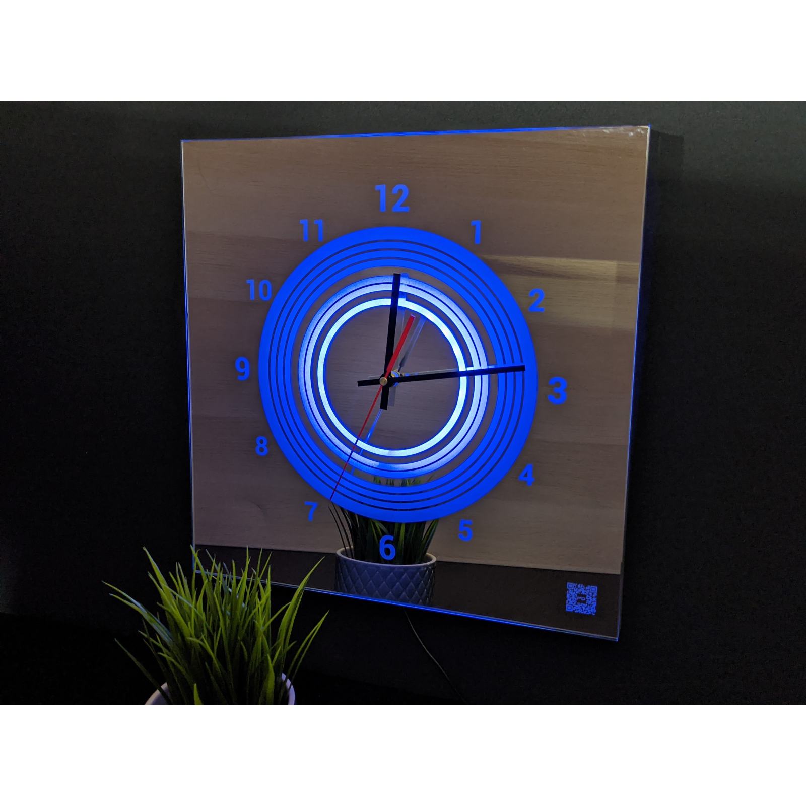 De Neon Mirror Clock is een klok dat is opgebouwd uit een geslepen spiegel waarvan het zilver aan de achterkant op de plek van de wijzerplaat is weg gegraveerd met een co2 laser, een aluminium lijst en RGB led verlichting met talloze functies en kleurencombinaties.