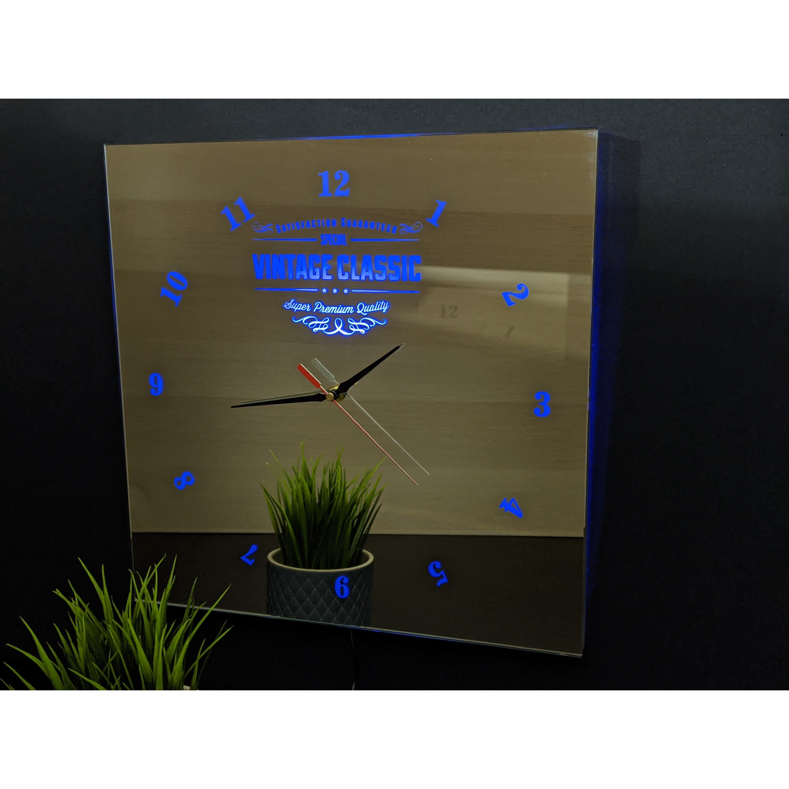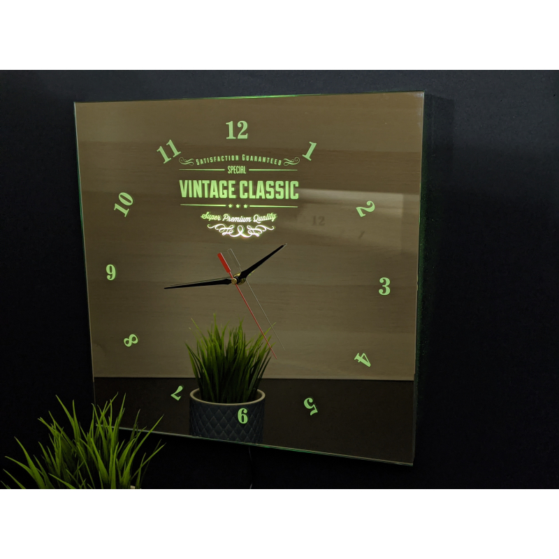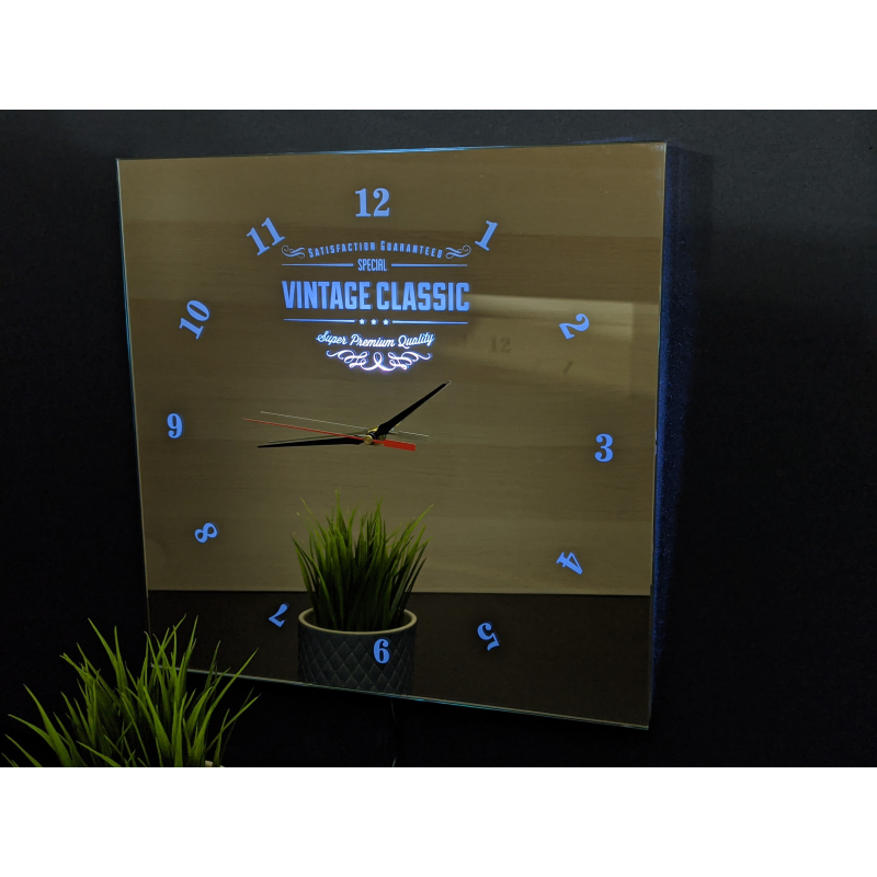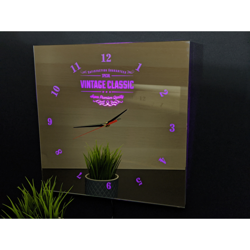 De Neon Mirror Clock is een klok dat is opgebouwd uit een geslepen spiegel waarvan het zilver aan de achterkant op de plek van de wijzerplaat is weg gegraveerd met een co2 laser, een aluminium lijst en RGB led verlichting met talloze functies en kleurencombinaties.